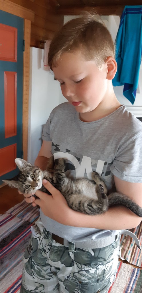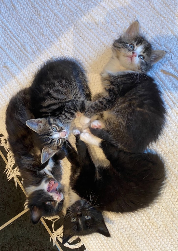 Frigg traff en bakgårdskatt her på Garten og vipps – før hun selv fylte året våren 2020 var hun “teenage – mum” til fire små nøster. Fire superfine kattunger. Her fikk jeg og storesøster velge en kattunge hver å beholde, og to av kattungene ble gitt bort til venner. Vi beholdt de to svarte Saga og Ravn. Ravn ble min bestevenn til han dessverre ble syk og døde altfor tidlig vinteren 2022, før han rakk å bli to år. Etter en stund fikk jeg mine første to norske skogkatter – Hermine og Hedvig.