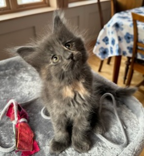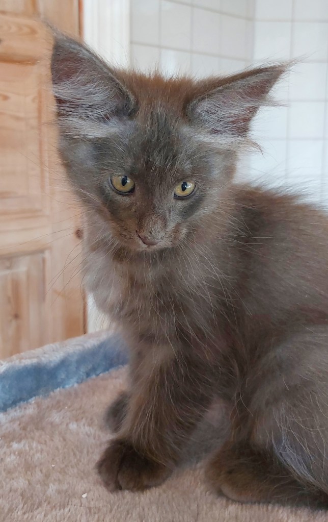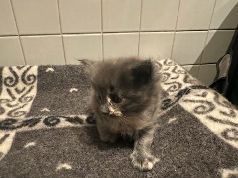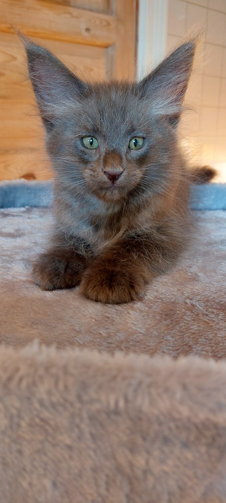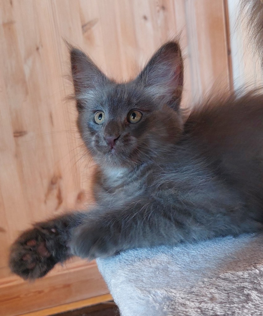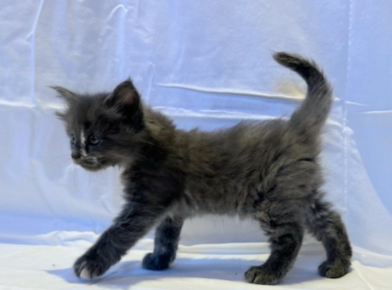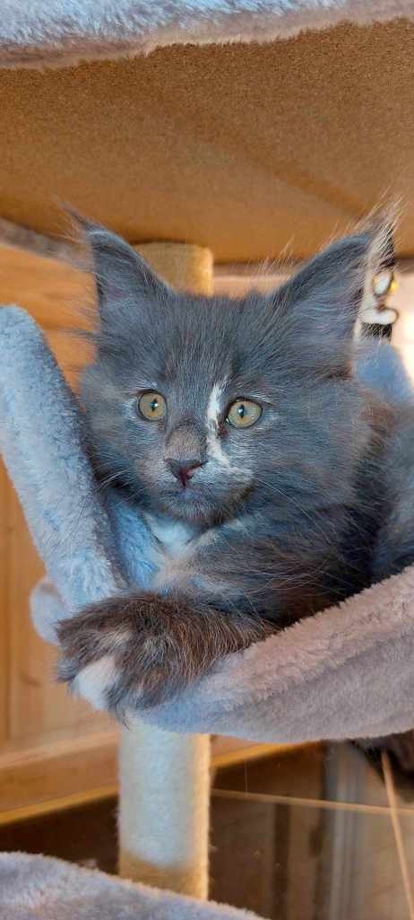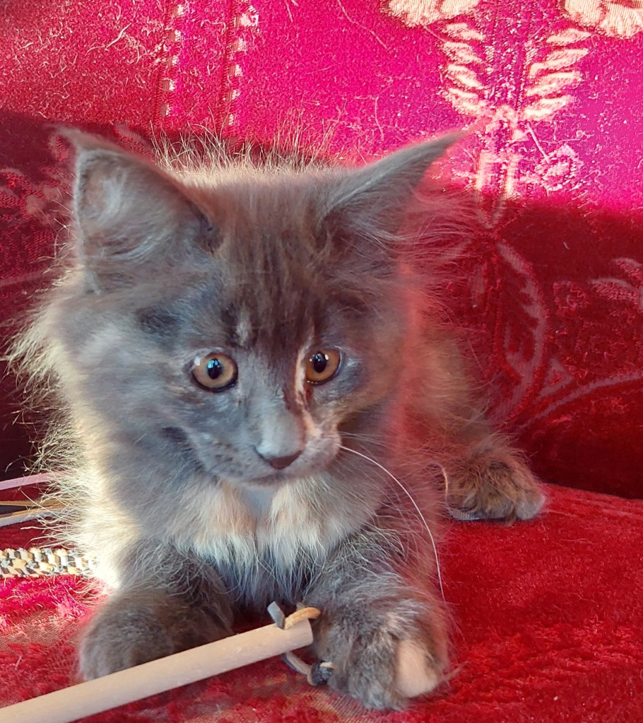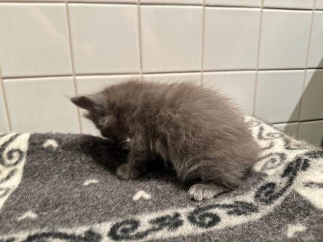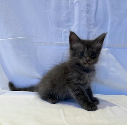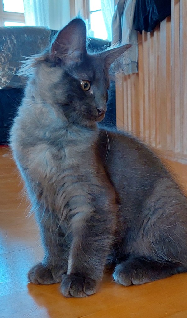 Fosenkattens Abigail NFO g er en solidfarget blåskilpadde med vakker gråfarge og nydelig creme flekker. Hun er kullets sjarmtroll. Hun er den mest kontaktsøkende av kattungene og er utrolig søt.